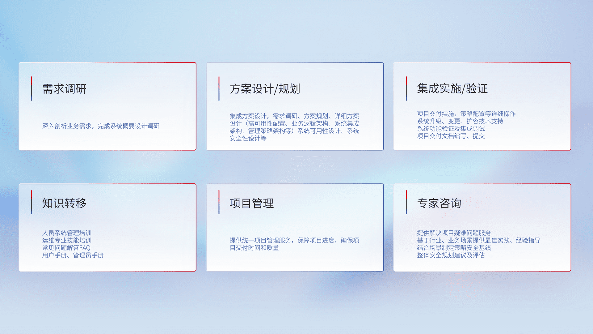 针对客户行业特性,,将宏观的安全战略和需求,,,,通过专业的交付服务,,,,实现项目落地,,,,为客户提供标准规范的集成交付服务。。。。